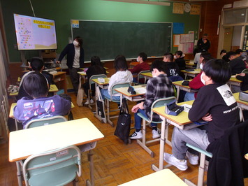 最初に音楽堂で授業に関する説明を聞きました。その後、各教室に分かれて1時間目は、理科(砂川小)、社会(豊沼小・空知太小)、英語(中央小・北光小)、2時間目は、英語(砂川小)、理科(中央小・北光小)、社会(豊沼小・空知太小)の授業を受けました。