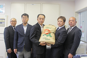 学校給食センターに杉本雄馬会長(写真右から2人目)、渡辺達郎副会長(写真右から1人目)、小島 淳副会長(写真左から1人目)が来所され、贈呈セレモニーでは、杉本会長から「今年は猛暑の影響で苦労しましたが、生産者の努力で質の良いおいしいお米が出来ました。地元でつくった安全安心なお米を地元の子ども達においしく食べてもらえたら嬉しいです。」とご挨拶をいただきました。