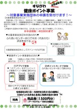 団体の事業が健康ポイント対象事業に承認された場合、参加されている方にポイントを付与します。現在ポイント対象事業の通年で実施している運動系のふれあいセンター講座、通年型介護予防教室「いきいきシニアプログラム」と同様に1ポイントを付与します。対象事業への参加をご希望される団体の代表者の方は、ふれあいセンターへ申請をしてください。