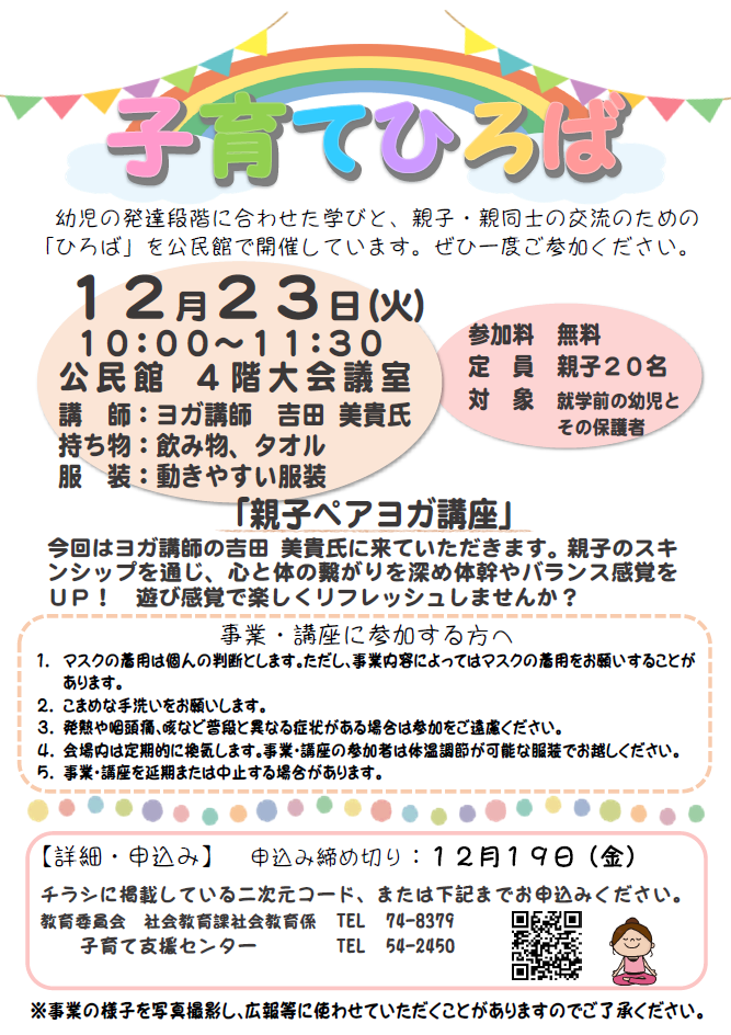 幼児の発達段階にあわせた学びと、親子・親同士の交流のための「ひろば」を公民館で開催しています。今回はヨガ講師の吉田美紀氏に来ていただき、親子でできるペアヨガ講座を行います。ぜひご参加ください。