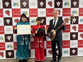 津軽すこっぷ三味線すながわ会の猿渡万里子会長(芸名:舘岡栞里歩)(写真中央)と佐賀美香副会長(芸名:舘岡実衣奏)(写真左)が、「第1回津軽すこっぷ三味線全日本大会 in すながわ」の報告に来てくれました。