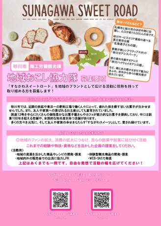 砂川市の商店街や地域の資源の魅力をPRし、地域の活性化に情熱を持って取り組める方を募集しています。地域おこし協力隊の活動では様々な経験や人脈を得ることができます。