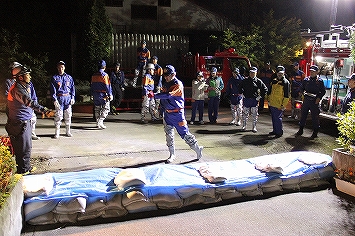 東4条南において消防団による水防訓練として、土のう積み訓練が行われました。今回は豊栄地区において「水害の発生が予想される」との想定で行われ、消防団16人が土のうを作るところから初め、軒先に重い土のうを素早い行動で2列2段に並べていました。消防団の皆さんも「水位が上がるのが非常にスピードが速いので、もっと早く積もう」など実践さながらの訓練に真剣に取り組んでいました。