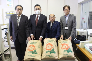 砂川市水稲振興会の井上善博会長、伊藤孝吉副会長、菊地匡副会長より、学校給食用として、精米されたJA新すながわ産 「特別栽培米ゆめぴりか」135キログラムをご寄付いただきました。平成23年から数え、今回で15回目となります。「特別栽培米ゆめぴりか」は、たんぱく質含有量を抑え、独自の品質基準をクリアした厳選米。粘りがあり、甘みあるのが特徴です。井上会長は、「昨年は収穫量が少なかったものの、おいしいお米ができました。ご飯そのものの味を楽しんでほしい」と話されていました。